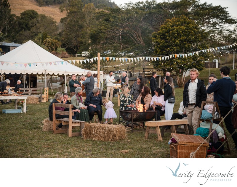 As the sun set over the rugged escarpment of local landmark Nimbin Rocks and the cool, damp evening fell, the milling crowds were entertained with music, warm conversation around the fire pits, dancing, and ice cream before the happy couple headed off with the usual boisterous celebrations, complete with car cans and shaving cream decor, and the guests wound their way safely home.